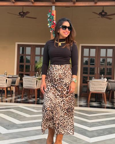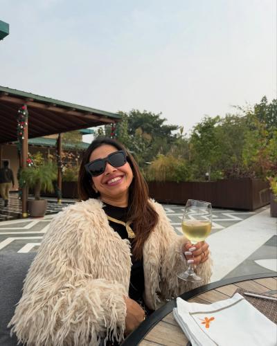 श्रेयाने स्कर्ट आणि टॉप परिधान करत फोटोसाठी पोझ दिल्या आहेत. तिच्या हातात वाईनचा ग्लासही दिसत आहे.