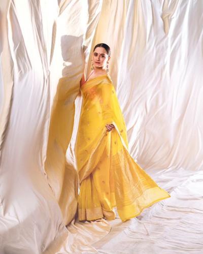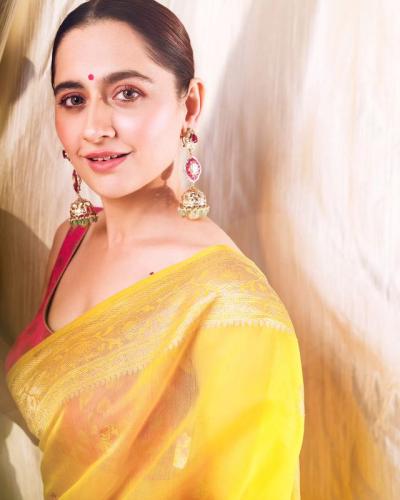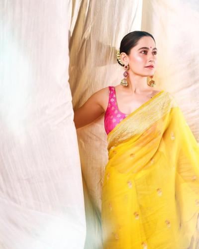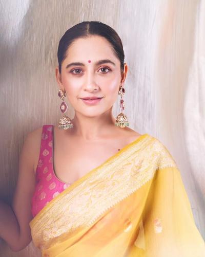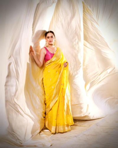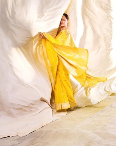 पिवळ्या रंगाची साडी त्यावर ऑफ शोल्डर ब्लाऊज तसेच कानात झुमके असा पारंपरिक पेहराव करत तिने नवं फोटोशूट केलंय.