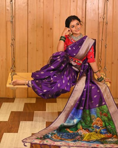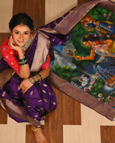 फोटोंमध्ये जुईने जांभळ्या रंगाची हॅंडलूम प्रिंटेड साडी नेसली आहे. तसेच पदरावर प्रिंट केलेले राधा-कृष्ण प्रेक्षकांच लक्ष वेधून घेत आहेत.