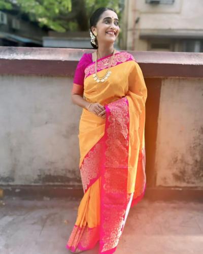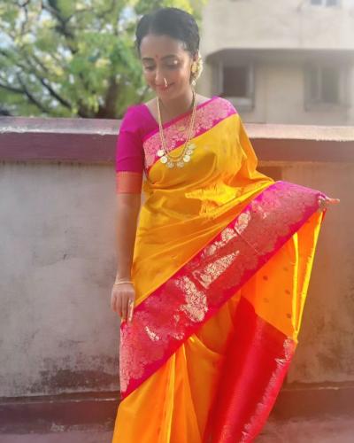 ऋजुता देशमुख यांनी गुलाबी बॉर्डर आणि पिवळा रंग असलेली साडी नेसली आहे