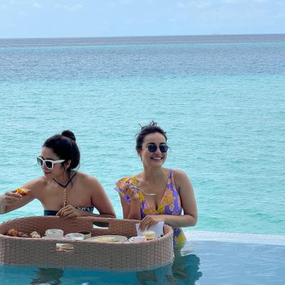 आशासोबत तिची बेस्ट फ्रेंड आणि अभिनेत्री सुरभी चंदनाही दिसत आहे. दोघीही पाण्यातच फ्लोटिंग ब्रेकफास्टचा आस्वाद घेत आहेत.