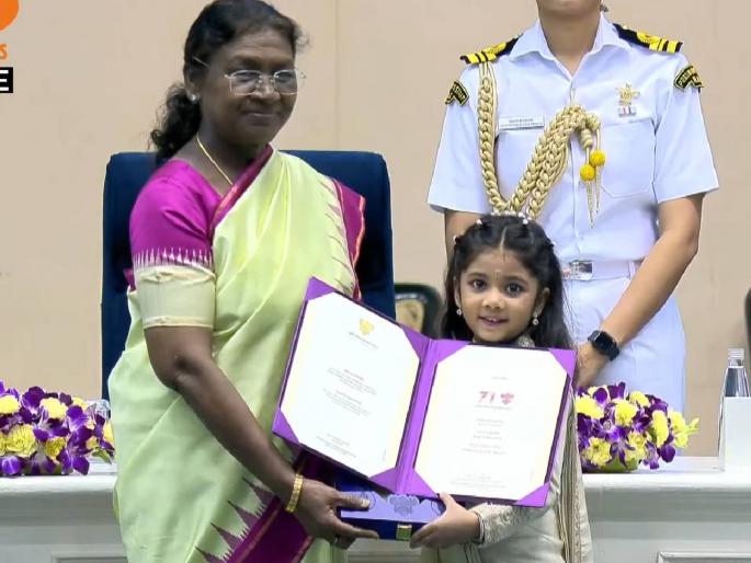 1 / 971st National Film Awards: ७१वा राष्ट्रीय चित्रपट पुरस्कार सोहळा नुकताच पार पडला. मंगळवारी(२३ सप्टेंबर) दिल्लीत राष्ट्रपती द्रौपदी मुर्मूंच्या हस्ते राष्ट्रीय पुरस्कार विजेत्यांचा गौरव करण्यात आला. 2 / 9मराठीतील ४ बालकलाकारांना यंदाच्या राष्ट्रीय पुरस्कारात सन्मानित करण्यात आले. 'नाळ २' चित्रपटासाठी श्रीनिवास पोकळे, त्रिशा ठोसर, भार्गव जगताप तर जिप्सी सिनेमासाठी कबीर खांडारे याला सर्वोत्कृष्ट बालकलाकाराचा पुरस्कार मिळाला. 3 / 9पण, या सगळ्यात लक्ष वेधून घेतलं ते चिमुकल्या त्रिशा ठोसर हिने. राष्ट्रीय पुरस्कार स्वीकारण्यासाठी त्रिशा चक्क साडी नेसून गेली होती. 4 / 9४ वर्षीय त्रिशाचा आत्मविश्वास पाहून उपस्थितही भारावून गेले. त्रिशा स्टेजवर जाताच सगळ्यांनी टाळ्यांचा गडगडात तिला प्रोत्साहन दिलं. 5 / 9राष्ट्रीय चित्रपट पुरस्कार सोहळ्यातील व्हिडीओ व्हायरल झाल्यानंतर त्रिशाचं सर्वत्र कौतुक होत आहे. पण राष्ट्रीय पुरस्कार सोहळ्यात साडी नेसून मिरवणारी त्रिशा नक्की आहे तरी कोण? 6 / 9त्रिशा ही मराठी सिनेसृष्टीतील लोकप्रिय बालकलाकार आहे. काही सिनेमा, जाहिराती आणि वेब सीरिजमध्ये तिने काम केलं आहे. 7 / 9'नाळ २'मध्ये त्रिशाने चिमीची भूमिका साकारली होती. सिद्धार्थ जाधवच्या सिनेमातही ती झळकली आहे. 8 / 9महेश मांजरेकरांच्या आगामी मराठी सिनेमात त्रिशा महत्त्वाची भूमिका साकारताना दिसणार आहे. 9 / 9'मानवत मर्डर्स', 'पेट पुराण' या वेब सीरिजमध्येही त्रिशा झळकली आहे.
