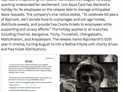 सुपरस्टार रजनीकांत यांचा 'कुली' हा चित्रपट सध्या चर्चेत आहे. हा अॅक्शन चित्रपट आज १४ ऑगस्ट रोजी प्रदर्शित झाला आहे. सुपरस्टार रजनीकांत यांचे चाहते देशभरातच नव्हे तर परदेशातही पसरलेले आहेत. त्यांच्या चित्रपटासाठी प्रेक्षकांचा उत्साह हा नेहमीच पाहण्यासारखा असतो. जेव्हा त्यांचा नवीन चित्रपट प्रदर्शित होतो, तेव्हा चाहत्यांकडून भव्य स्वागत, मोठ्या प्रमाणात पोस्टरवर दूधाचा अभिषेक आणि विविध धार्मिक विधी केले जातात. काही चाहते तर त्यांना देवतासमान मानतात. त्यांच्या नावाने आणि प्रतिमेसमोर नियमित पूजा-अर्चा करतात. इतकंच नाही आता 'कुली' चित्रपट पाहण्यासाठी काही कंपन्यांनी आपल्या कर्मचाऱ्यांना चित्रपट पाहण्यासाठी सुट्टी दिली आहे. तसेच तिकिटांची जबाबदारीही स्वतः घेतली आहे.