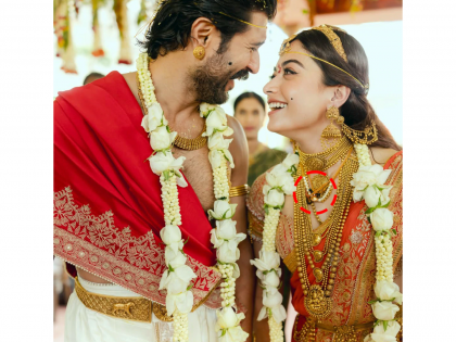 अभिनेत्री सहसा हिऱ्यांनी जडलेली किंवा महागड्या डिझायनर मंगळसूत्रांना पसंती देतात. मात्र, रश्मिकाने दाक्षिणात्य परंपरेनुसार 'पिवळ्या धाग्यात गुंफलेले काळे मोती' असलेले मंगळसूत्र परिधान केलं. दाक्षिणात्य संस्कृतीत या साध्या पण पवित्र धाग्याला विशेष महत्त्व आहे.