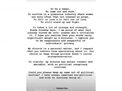 कोंडा सुरेखा यांच्या या दाव्यानंतर समंथा रुथ प्रभूने इन्स्टाग्रामवर लांबलचक पोस्ट शेअर केली. ती लिहिते, "एकस स्त्री असणं, बाहेर येऊन काम करणं, ग्लॅमरस इंडस्ट्रीत जिथे महिलांना एक वस्तू म्हणून दाखवलं जातं तिथे स्वत: टिकून राहणं, प्रेमात पडणं आणि त्यातून बाहेर येणं तरी पुन्हा उभं राहणं.. या सगळ्यासाठी खूप हिंमत आणि ताकद लागते. कोंडा सुरेखा सर मी या प्रवासातून जी व्यक्ती बनले याचा मला अभिमान आहे. कृपया याला कमी समजू नका. एक मंत्री म्हणून तुमचे शब्द किती महत्वाचे आहेत याचं तुम्हाला गांभीर्य असेल अशी मला आशा आहे. माझी तुम्हाला विनंती आहे की जबाबदार व्हा आणि इतरांच्या प्रायव्हसीचा आदर करा. माझा घटस्फोट हा माझा वैयक्तिक प्रश्न आहे. याच्यावर तुम्ही मत देऊ नका. आम्ही हे खाजगी ठेवलं याचा अर्थ तुम्ही काहीही तर्क वितर्क लावाल असा होत नाही. आमचा घटस्फोट परस्पर सहमतीने झाला यात राजकारणाचा संबंध नाही. राजकीय भांडणांमधून माझं नाव बाजूला ठेवा ही विनंती. मी नेहमीच अराजकारणी राहिले आणि पुढेही मला तसंच राहायचं आहे."