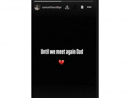 समंथा रुथ प्रभूने काही वेळापूर्वी इन्स्टाग्रामवर स्टोरी शेअर करत लिहिले, 'बाय डॅड, तोपर्यंत जोवर आपली पुन्हा भेट होत नाही.' यासोबत तिने हार्टब्रेक इमोजी शेअर केला आहे. समंथाचे वडील जोसेफ हे तेलुगू अँग्लो इंडियन होते. तर तिच्या आईचं नाव निनेत्ते प्रभू आहे. समंथाचा जन्म चेन्नईत झाला. आता तिच्या डोक्यावरुन वडिलांचं छत्र हरपलं आहे. याचा तिला धक्का बसला आहे.