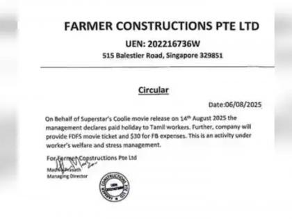 सोशल मीडियावर एका कंपनीने काढलेली नोटिस व्हायरल झाली आहे. फार्मर कन्ट्रक्शन्स कंपनी प्रायव्हेट लिमिटेड यांनी ही नोटिस काढली आहे. यामध्ये लिहिलंय की १४ ऑगस्टला रजनीकांतचा 'कुली' हा सिनेमा रिलीज होणार आहे. त्यानिमित्ताने कर्मचाऱ्यांना सुट्टी जाहीर करण्यात आली आहे. याशिवाय कंपनीने सर्वांना 'कुली' सिनेमाची तिकिटंही दिली आहेत. इतकंच नव्हे तर, कर्मचाऱ्यांसाठी शोनंतर जेवणाचीही सोय करण्यात आली आहे. त्यामुळे या कंपनीतील कर्मचाऱ्यांमध्ये आनंदाचं वातावरण आहे. ही कंपनी सिंगापूरमध्ये आहे. त्यामुळेच 'कुली' सिनेमाची भारतात नव्हे तर परदेशातही चांगलीच क्रेझ असल्याचं दिसतंय.