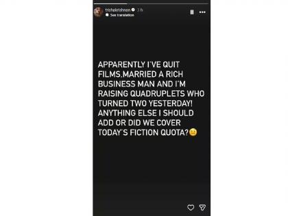 तृषाने इन्स्टाग्रामवर शेअर केलेल्या स्टोरीमध्ये असं म्हटलं आहे की "मी सिनेइंडस्ट्री सोडली आहे. एका बिजनेसमॅनसोबत मी लग्न केलं आहे आणि ४ मुलांची आई झाली आहे. ती मुलं २ वर्षांची झाली आहेत. अजून काही राहिलं आहे का? की आजच्या अफवांचा कोटा भरला आहे?". तृषाने या पोस्टमधून तिच्याबद्दलच्या सर्व अफवांना पूर्णविराम दिला आहे.
