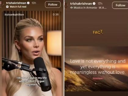 त्रिशा कृष्णनने इन्स्टाग्रामवर एक पोस्ट शेअर केली. त्यात असे लिहिले आहे की, 'प्रेम हेच सर्वकाही नाही तरी प्रेमाशिवाय कशालाच अर्थ नाही.' यासोबत तिने एक व्हिडीओही शेअर केला आहे. ज्यात म्हटले आहे की, 'मी आता आयुष्याच्या त्या टप्प्यावर आहे जिथे तुम्ही मला म्हणाल की हत्ती उडू शकतात तर मी कोणताही वाद न घालता मान्य करेन. याचा अर्थ हा नाही की मला हे पटलंय पण तुम्ही काय विचार करता याच्याशी मला घेणंदेणं नाही."