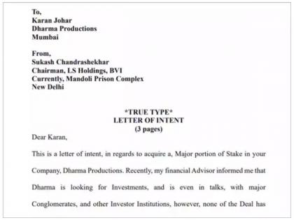 सुकेश चंद्रशेखरने हे 'लेटर ऑफ इंटेंट' लीगल फर्म अनंतमच्या माध्यमातून धर्मा प्रॉडक्शन आणि करण जोहरला पाठवलं आहे. त्यावर लिहिलं आहे, तुम्ही तुमची कंपनी धर्मा प्रोडक्शनसाठी गुंतवणूकदार शोधत आहात. माझ्या आर्थिक सल्लागाराने मला सांगितलं की धर्मा प्रॉडक्शनने यासाठी अनेक मोठ्या कंपन्यांशी चर्चा केली आहे. माझी कंपनी एलएस होल्डिंग्स ब्रिटिश व्हर्जिन आयलंडमध्ये नोंदणीकृत आहे. आम्हाला ऑनलाइन गेमिंग, मायनिंग, कॉर्पोरेट कनेक्शनमध्ये स्वारस्य आहे.