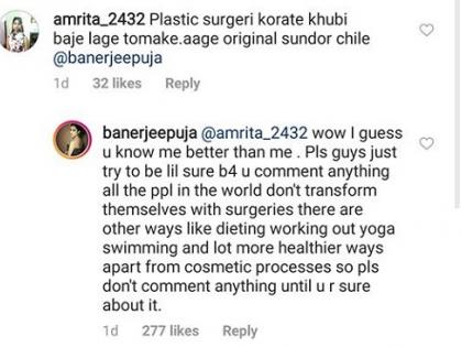 युजर्सच्या या प्रतिक्रिया पूजा सहन करू शकली नाही. मग काय, तिनेही युजर्सला खरमरीत उत्तर दिले. ‘वा, कदाचित तुला माझ्यापेक्षा अधिक ठाऊक आहे. काहीही लिहिण्यापूर्वी विचार कर. जगात लोक केवळ प्लास्टिक सर्जरीने बदलत नाहीत. सर्जरीशिवायही अनेक पर्याय आहे. डायटिंग, योग, वर्कआऊट यानेही लोक बदलतात. माहित नसताना उगाच बरळू नकोस...’, असे पूजाने लिहिले.