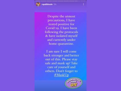 आई कुठे काय करते मालिकेत संजनाची भूमिका साकारणाऱ्या अभिनेत्री रुपाली भोसलेला कोरोनाने गाठलं आहे. रुपाली इन्स्टा स्टोरीवरुन ही माहिती दिली. रुपालीने स्वत:ला आयसोलेशनमध्ये आहे. ती घरात क्वारांटाईन झाली आहे. ''सर्व काळजी घेऊन ही माझी टेस्ट पॉझिटीव्ह आली आहे. मी लवकरच यातून बरी होईन, प्लीज सगळ्यांना काळजी घ्या, मास्क लावा आणि शक्य असले तर घरीच राहा.'' अभिनेत्रीने तिच्या चाहत्यांना काळजी घ्यायला सांगितली आहे.