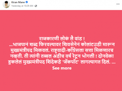 किरण माने हे सोशल मीडियावर नेहमीच सक्रिय असून विविध मुद्द्यांवर आपलं मत व्यक्त करत असतात. आताही त्यांची "राजकारणी लोकं लै वांड!" ही फेसबुक पोस्ट जोरदार व्हायरल होत असून सर्वांचं लक्ष वेधून घेत आहे. "राजकारणी लोकं लै वांड! भाजपाने शब्द फिरवल्यावर शिवसेनेने कोलांटउडी मारून मुख्यमंत्रीपद मिळवलं. राष्ट्रवादी-काँग्रेसला सत्ता मिळणारच नव्हती. ती त्यांनी तब्बल अडीच वर्ष रेटून भोगली! दोनवेळा हुकलेलं मुख्यमंत्रीपद शिंदेकडे 'जॅकपॉट' लागल्यागत दिलं. या सगळ्यात ज्यांची मुख्यमंत्रीपदासाठी तडफड चालली होती, ते बिचारे निरूपयोगी पदावर बसवले!" असं म्हटलं आहे.