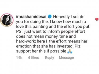 लोकमतशी बोलताना, “जर माझ्याकडे अजून चित्रे असती तर अजून मोठी मदत उभी केली असती. मला माहिती नाही सध्या काय करणे योग्य आहे. आज हजारो लोक आयुष्याशी लढा देत आहेत आणि त्यांना मदतीची गरज आहे. अशावेळी मला वाटले कि माझ्या या चित्रांचा लिलाव करून, ज्यांना त्वरित मदतीची गरज आहे त्यांच्यासाठी मी थोडीफार आर्थिक मदत नक्कीच उभी करू शकते.