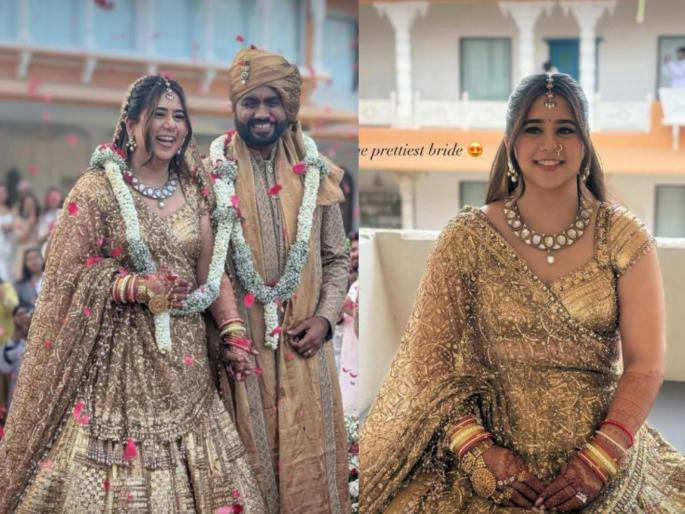 दीपिका चिखलिया यांनी व्हिडीओ पोस्ट करत लेकीला आशीर्वाद दिला आहे. जुहीचा गोल्डन लेहेंग्यातील फोटो त्यांनी आधी दाखवला. लेहेंग्यावर बारीक नक्षीकाम आहे. गळ्यात भरजरी हार, कपाळावर बिंदी, नथ, हातात सोन्याच्या बांगड्या अशा सोने-हिरेजडित दागिन्यांनी ती मढलेली दिसत आहे. नंतर जुही आणि तिचा पती गळ्यात वरमाला घालून उभे आहेत आणि आजूबाजूला बरेच कुटुंबीय उपस्थित आहेत. 'सर्वात सुंदर वधू' असं कॅप्शन त्यांनी दिलं आहे.