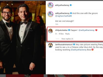परिणीती आणि राघव चड्ढा यांच्या लग्नातील या unseen फोटोने नेटकऱ्यांचं लक्ष वेधून घेतलं आहे. या फोटोवर चाहत्यांनी कमेंटही केल्या आहेत. पण, एका मराठी अभिनेत्रीने आदित्य यांच्या फोटोवर केलेली कमेंट चर्चेत आहे. मराठी अभिनेत्री शिल्पा तुळसकरने आदित्य आणि राघव यांच्या फोटोवर "Dapper" अशी कमेंट केली आहे. आदित्य ठाकरेंना टॅग करत शिल्पाने हार्ट इमोजीही पोस्ट केले आहेत.तिच्या या कमेंटने सगळ्यांचं लक्ष वेधून घेतलं आहे.