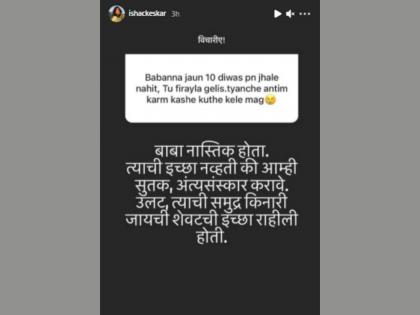 इंस्टाग्रामवर चाहत्यांशी गप्पा मारताना एका चाहत्याने तिला 'बाबांना जाऊन १० दिवस पण झाले नाहीत, तू फिरायला गेलीस. त्यांचे अंत्यसंस्कार कसे आणि कुठे केले? असे विचारले. त्यावर ईशा म्हणाली की, 'बाबा नास्तिक होता. त्याची इच्छा नव्हती की आम्ही सुतक, अंत्यसंस्कार करावे. उलट, त्याची समुद्र किनारी जायची शेवटची इच्छा राहिली होती.'