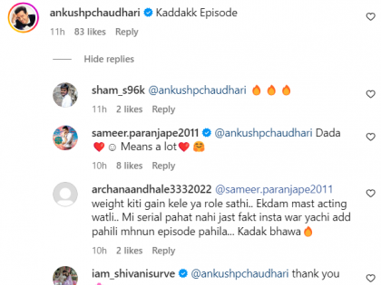 शिवानी सुर्वेची नवी मालिका पाहून अंकुश चौधरीने दिलेली प्रतिक्रिया लक्ष वेधून घेतेय. अंकुशने स्टार प्रवाहच्या पोस्टवर कमेंटच्या माध्यमातून त्याची प्रतिक्रिया नोंदवली आहे. 'थोडं तुझं आणि थोडं माझं' मालिकेचा पहिला भाग पाहून एकदम कडक असं अंकुश म्हणाला. अंकुशने दिलेल्या प्रतिक्रियेवर शिवानी आणि समीरने त्याचे आभार मानले. अशाप्रकारे बहुचर्चित 'थोडं तुझं आणि थोडं माझं' मालिका सुरु होताच लोकांच्या चांगल्या प्रतिक्रिया यायला सुरुवात झाली आहे.