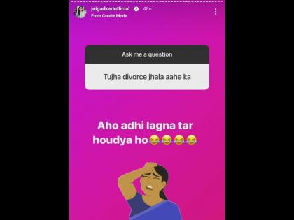 या नेटकऱ्याने जुईला तुझा घटस्फोट झाला आहे का? असे विचारले. त्यावर अभिनेत्रीने म्हटले, अहो, आधी लग्न तर होऊ द्या. या उत्तरासोबत तिने हसणारी स्माइली आणि डोक्याला हात लावणाऱ्या महिलेचा स्टिकर शेअर केला आहे. जुईने या सेशनमध्ये चाहत्यांनी विचारलेल्या प्रश्नांची मनमोकळेपणाने उत्तरे दिली.