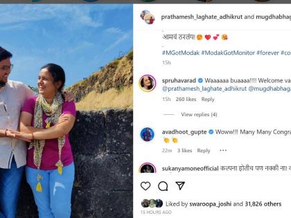 याशिवाय अभिनेत्री सुकन्या मोने यांनीही त्यांच्या खास शैलीत कमेंट केली. त्या लिहितात,'कल्पना होतीच पण नक्की ना! काहीतरी गुगली नाही ना?' तर 'वाह बुआ!!वेलकम वहिनी' अशी कमेंट अभिनेत्री स्पृहा जोशीने केली आहे. प्रथमेश आणि मुग्धा दोघांवरही कलाकार आणि चाहत्यांकडून अभिनंदनाचा वर्षाव होतोय.