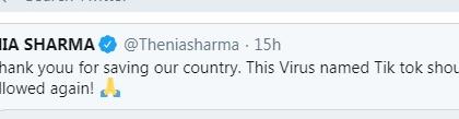 सोशल मीडियावर पोस्ट लिहित तिने टिकटॉकवरील बंदीचे स्वागत केले आहे. ‘देश वाचवल्याबद्दल आभार. टिकटॉक नावाच्या व्हायरसला पुन्हा परवानगी देऊ नका,’ असे तिने तिच्या पोस्टमध्ये लिहिले आहे.