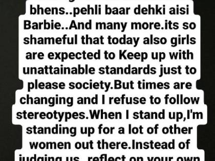 ती पुढे लिहिते,'जेव्हा मी उभी राहते तेव्हा ते इतर महिलांसाठीही फायदेशीरच आहे. आम्हाला जज न करता स्वत:चं कॅरेक्टर आधी तपासा आणि चांगला व्यक्ती होण्याकडे लक्ष केंद्रित करा. समाजाला आपले विचार बदलण्याची आणि टॉक्झिक ब्युटी स्टँडर्ड्समधून बाहेर पडण्याची गरज आहे.'