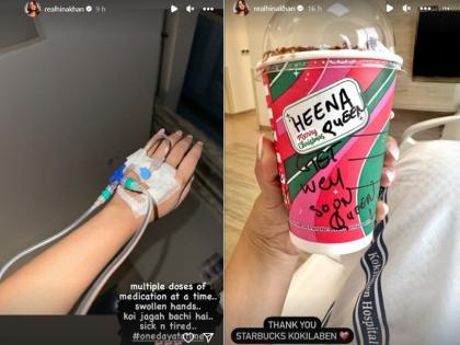 हिनाने तिच्या इन्स्टाग्राम स्टोरीमध्ये तिचे हॉस्पिटलमधले काही फोटो शेअर केले आहेत. या फोटोमध्ये तिने थर्मामीटचा एक फोटो शेअर केलाय ज्यात तिला १०२ डिग्रीपेक्षा जास्त ताप असल्याचं दिसून येत आहे. तसंच एका फोटोमध्ये तिच्या हाताला सलाइन लावल्यांचही दिसून येत आहे.