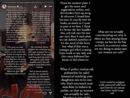 ती पुढे म्हणाली,"या माणसाच्या रॅश ड्रायव्हिंगमुळे रस्त्यावरील लोक असुरक्षित होतेच शिवाय तो मागे हटणार नाही अशाच आविर्भावात आमचा पाठलाग करत होता. आम्ही अगदी त्याचं रेकॉर्डिंगही केलं, त्याची नंबर प्लेट नोट केली आता काय दुबईपर्यंत माझा पाठलाग करणार का असं मला वाटलं? रिक्षाचालकाने मध्येच रिक्षा थांबवली तर या माणसानेही त्याची कार रस्त्याच्या मधोमधच थांबवली. मग युटर्न घेऊन जोरात येत होता. शेवटी मी जुहू पोलिस स्टेशनबाहेर रिक्षा नेली. सगळे लेटंट लेटंट करत आहेत, पण महिलांच्या सुरेक्षवरही लक्ष द्या. हा माणूस जॅग्वारमध्ये होता म्हणजेच पैसेवाला असणार आणि आम्ही रेकॉर्ड करतोय हे माहित असून तो तसाच वागत होता."