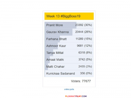 'बिग बॉस १९' च्या व्होट पेजनुसार, सध्या सर्वाधिक मते मिळवणारा स्पर्धक दुसरा तिसरा कोणी नसून महाराष्ट्राचा लाडका प्रणित मोरे आहे. प्रणित मोरेला २३,३९२ मते मिळाली आहेत, म्हणजेच तब्बल ३०% मते घेऊन तो सध्या पहिल्या क्रमांकावर आहे. गौरव खन्ना २०,४४४ मते म्हणजेच २६% मिळवून दुसऱ्या क्रमांकावर आहे. या यादीत फरहाना भट तिसऱ्या क्रमांकावर, तर अशनूर चौथ्या क्रमांकावर आहे. यावरून स्पष्ट होतं की, गौरव खन्ना, फरहाना किंवा अशनूर यांच्यापेक्षा महाराष्ट्राचा लाडका प्रणित मोरे सध्या प्रेक्षकांच्या मनात घर करून आहे.