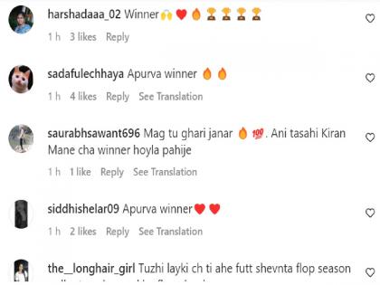 अपुर्वाच्या या पोस्टवर काही प्रेक्षक मात्र तिला ट्रोल करत आहेत. 'जशी आहे तशीच राहणार आणि अशीच बाहेर जाणार, मग तू घरी जाणार' अशा कमेंट करत नेटकऱ्यांनी तिला ट्रोल करायला सुरुवात केली आहे. तर काही जणांनी अपुर्वाच विनर असं म्हणत तिला पाठिंबा दिला आहे.