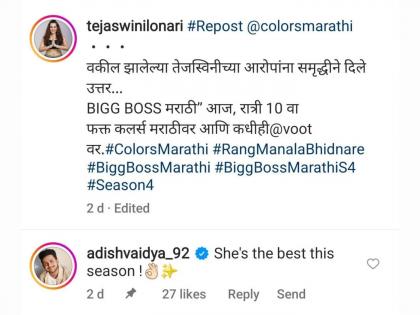 केवळ चाहते नव्हे तर बिग बॉसच्या मागील सिजन चे स्पर्धक देखील तिच्या संयमी वृत्तीचे कौतुक करत आहे. गत सिझन चा वाईल्ड कार्ड सदस्य आदिष वैद्यने तेजस्विनीला पसंती दर्शवली आहे.
