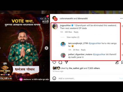 कलर्स मराठीच्या ऑफिशियल सोशल मीडिया पेजवरुन नॉमिनेट झालेल्या सदस्यांबाबत एक पोस्ट शेअर करण्यात आली आहे. या पोस्टवर अभिनेता पुष्कर जोगने कमेंट करत या आठवड्यात कोणता सदस्य घराबाहेर जाईल, याबाबत अंदाज लावला आहे. "या आठवड्यात घनश्याम घराबाहेर जाईल", अशी कमेंट पुष्करने केली आहे. पण, याबरोबरच पुढच्या आठवड्यात डीपी दादा घराबाहेर जातील, असंही त्याने म्हटलं आहे. त्यामुळे धनंजयचे चाहते चिडले आहेत. चाहत्यांनी पुष्करच्या या कमेंटवर रिप्लाय केला आहे.