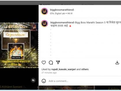 बिग बॉस मराठी ५ चे अपडेट्स देणाऱ्या एका इन्स्टाग्राम पेजवरुन एक पोस्ट शेअर करण्यात आली आहे. यामध्ये बिग बॉस मराठी ५चा विजेता कोण? याबाबत माहिती देण्यात आली आहे. सूरज चव्हण बिग बॉस मराठी ५ चा विजेता असल्याचं या पोस्टमध्ये म्हटलं गेलं आहे. सोशल मीडियावर ही पोस्ट व्हायरल झाली आहे. या पोस्टवर चाहत्यांनी कमेंटही केल्या आहेत.