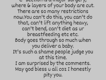 पुढे तिनं लिहलं, 'बाळाला जन्म दिल्यानंतर शरीरात अनेक बदल होतात. अशा काळात तुमचं मूल्यांकन केलं जाणं ही लाजिरवाणी गोष्ट आहे. असं ट्रोलिंग आश्चर्यचकित आहे. असे विचार ठेवणाऱ्यांची मला दया येत असून त्यांच्याबद्दल वाईट वाटतं आहे. देव तुमचं भलं करो. जर लोक थोडे अधिक समजूतदार, आदरणीय, दयाळू आणि आलोचना न करणारे असतील तर हे जग राहण्यासाठी एक चांगलं ठिकाण असेल'.