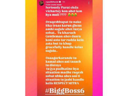 रुपाली भोसलेने राकेशला पाठिंबा देत त्याची साथ दिल्याबद्दल सागर कारंडेचंही कौतुक केलं आहे. इन्स्टाग्रामवर स्टोरी शेअर करत तिने अनुश्री आणि रुचिताला खडे बोल सुनावले आहेत. रुपालीने पोस्टमध्ये म्हटलंय की "सिरियसली परत एकदा विचारतेय कोण आहेत कोण या मुली? राकेश बापट तू इतका त्रास करून घेऊ नकोस. आम्ही सगळे तुझ्या सोबत आहोत. तू खरंच जेंटलमन आहेस. दुसरं कोणी असतं तर राडा केला असता... पण तू खूप चांगल्या पद्धतीने सगळं हँडल केलंस. सागर कारंडे तू कमाल आहेस आणि तसंच तू दिसतोस. तू ज्या पद्धतीने या संपूर्ण प्रकरणात राकेशसोबत उभा आहेस आणि ती परिस्थिती ज्याप्रकारे हाताळलीस त्यासाठी रिस्पेक्ट मित्रा...".