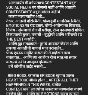 पुढे अभिनेत्याने 'बिग बॉसचं कौतुक करत म्हटलंय, "बिग बॉस मराठी' चा कालचा एपिसोड खूपच जास्त हृदयस्पर्शी होता. या आठड्यात जे काही घडलं ते, प्रत्येक स्पर्धकाला त्यांच्या जवळच्या माणसांना बघणं गरजेचं होतं. त्या भावना खरंच त्यांच्या मनातून आमच्यापर्यंत पोहचल्या". कमाल! अभिनेत्याने सोशल मीडियावर पोस्ट शेअर करत घरातील प्रत्येक सदस्याला टॅग देखील केलं आहे.
