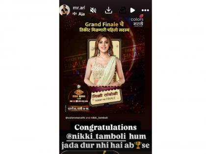बिग बॉसच्या पाचव्या पर्वात निक्की तांबोळी आणि अरबाज पटेल यांची जोडी खूप गाजली. दोघांनी मिळून एकापेक्षा एक टास्क जिंकले. दोघांनी फिनालेपर्यंत पोहोचायचं असाच त्यांचा प्रयत्न होता. मात्र कमी मतांमुळे अरबाजला दोन आठवड्यांपूर्वी घराबाहेर जावं लागलं होतं. आता निक्की फिनालेपर्यंत गेल्याने अरबाजने सोशल मीडियावर आनंद व्यक्त केला आहे. त्याने निक्कीचा फोटो शेअर करत लिहिले, 'अभिनंदन निक्की, आता आपण ट्रॉफीपासून जास्त दूर नाही'.