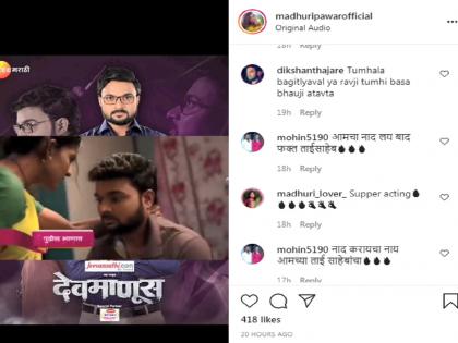 माधुरी पवारने ‘तुझ्यात जीव रंगला’ या मालिकेत नंदिता वहिनींची भूमिका साकारली होती. आधी ही भूमिका धनश्री काडगावकरने साकारली होती. पण तिने मालिकेला रामराम ठोकल्यावर माधुरीने नंदिता वहिनीच्या भूमिकेत मालिकेत दमदार एंट्री घेतली होती. धनश्री काडगावकरने मालिकेला गुडबाय म्हटल्याने ही भूमिका माधुरीकडे आली. या पात्राचं वेगळेपण जपत माधुरी देखील प्रेक्षकांच्या मनात आणि घराघरांत पोहोचली. आता ती ‘देवमाणूस’ या मालिकेत चंदाच्या भूमिकेत झळकत आहे.