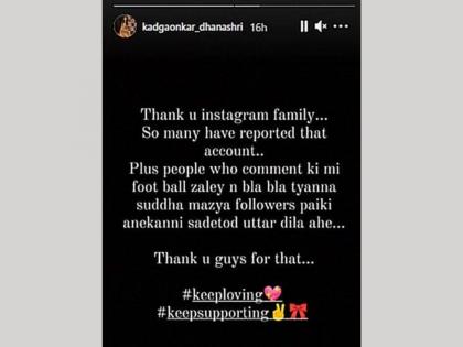 धनश्री काडगावकरने इंस्टाग्राम स्टोरीवर इंस्टाग्रामवरील फॉलोव्हर्सचे आभार मानले आहेत आणि अश्लील कमेंट करणाऱ्या व्यक्तीला तिच्यासोबत तिच्या चाहत्यांनी रिपोर्ट केले आहे. यावेळी तिने पोस्टमध्ये मी फुटबॉल झाले अशी कमेंट करणाऱ्यांना सुद्धा माझ्या फॉलोअर्सपैकी अनेकांनी सडेतोड उत्तर दिले आहे.तुमच्या सर्वांचे मनापासून आभार' असे म्हटले आहे.