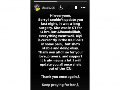 शोएब इब्राहिमने इन्स्टाग्रामवर पोस्ट शेअर करत लिहिले,"काल रात्री दीपिकावर शस्त्रक्रिया झाली. १४ तास ती ऑपरेशन रुममध्ये होती. देवाच्या कृपेने शस्त्रक्रिया यशस्वी झाली. सध्या दीपिका आयसीयूमध्ये आहे आणि तिला प्रचंड वेदना होत आहे. पण ती स्थिर आहे. तुम्ही सगळ्यांनी तिच्यासाठी प्रार्थना केली त्यासाठी मनापासून आभार. ती आयसीयूतून बाहेर आल्यावर मी पुढचे अपडेट देईनच. पुन्हा एकदा आभार."