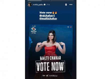 सध्या सोशल मीडियावर सगळेच प्रणित मोरे आणि गौरव खन्नाच्या गेमचे कौतुक करत त्यांच्यापैकी एकाला विजेता मानत आहेत. पण एल्विश यादवने मात्र त्यांना पाठिंबा दिला नाही. एल्विश यादवने थेट मालती चहर हिच्यासाठी मतदान करण्याचे आवाहन केले आहे. एल्विश यादवने मालती चहरचा फोटो सोशल मीडियावर शेअर करत फक्त "मतदान करा" (Vote Karein) असे लिहिले आहे.