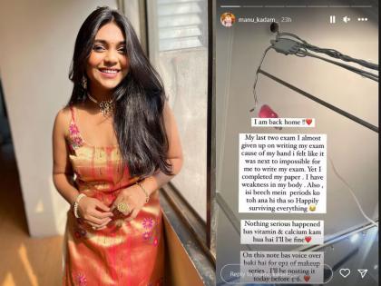 मृण्मयी कदम हिने इंस्टाग्रामवर शेअर केलेल्या फोटोत हाताला सलाइन लावलेले पाहायला मिळत आहे. तिने फोटो शेअर करत लिहिले की, माझी परीक्षा सुरू होती. शेवटच्या दोन पेपरच्या वेळी अचानक माझ्या हाताने लेखन करणे जवळ जवळ सोडून दिले होते. मलाही वाटले की आता काही पेपर देता येणार नाहीत. तरीही मी प्रयत्न करत पेपर लिहिले. माझ्या अंगात ताकद नसताना. त्यातच मासिक पाळीचे असह्य दुखणे..पण हे सगळं सहन केले. फार काही गंभीर नाही फक्त व्हिटॅमिन आणि कॅल्शियम कमी झालंय शरीरातलं. बाकी मी बरी आहे.