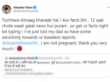 गौहर खान सध्या आपल्या आयुष्यातील सर्वात कठीण प्रसंगातून जात आहे. 5 फेब्रुवारी रोजी तिच्या वडिलांचे निधन झाले. या दु:खातून गौहर अजून सावरली देखील नाही त्याच दरम्यान सोशल मीडियावर चर्चा सुरु झाली की लग्नाच्या तीन महिन्यानंतर गौहर खान प्रेग्नेंट आहे. या चर्चेवर गौहर चांगलीच वैतागली आहे. तिने ट्विटरवर लोकांना 'संवेदनशील' होण्याचा सल्ला दिला आहे.