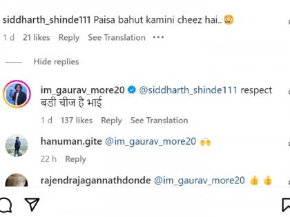 आणखी एका चाहत्याने गौरव मोरेच्या पोस्टवर तिखट प्रतिक्रिया देत लिहिले, 'पैसा बहुत कमिनी चीज है'. यावर गौरव म्हणतो, 'Respect बडी चीज है भाई.' कार्यक्रम का सोडला याचाही विचार होऊ द्या अशी प्रतिक्रिया त्याने चाहत्यांना दिली आहे.