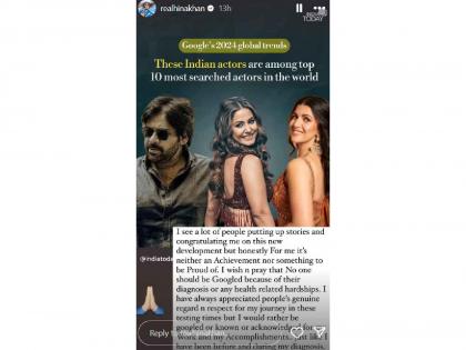 हिना खानने पोस्ट शेअर करत या प्रसिद्धीबाबत नाराजी व्यक्त केली आहे. इन्स्टाग्रामवर स्टोरी शेअर करत तिने लिहिले, "सध्या अनेकजण स्टोरी पोस्ट करत माझं अभिनंदन करत आहेत. पण प्रामाणिकपणे सांगायचं तर हे काही मला मिळालेलं कोणतं यश नाही आणि ना ही मला याचा गर्व आहे. मी प्रार्थना करते की एखाद्याला तो ज्या आजारातून जात आहे त्यासंदर्भात त्याला गुगलवर सर्च करु नये. माझ्या या कठीण प्रसंगी लोक माझा आदर आणि सम्मान करतात यासाठी मी त्यांची ऋणीच आहे. पण माझ्या कामासंदर्भातील किंवा एखाद्या यशासंदर्भातील गोष्टींसाठी मला गुगलवर सर्च केलं गेलं किंवा माझी दखल घेतली गेली तर मला आनंद होईल. अगदी तसंच जसं मला कॅन्सरच्या होण्याच्या आधी किंवा झाला असताना घडत होतं."