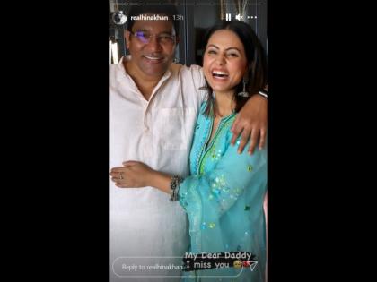 हिना खानने तिच्या इन्स्टाग्राम स्टोरीवर तिच्या वडिलांची अनेक फोटो शेअर केले आहेत. हिनाने फोटो शेअर करत लिहिलं, मला तुमची आठवण येते. 'प्रत्येक क्षणाचं फोटोत क्लिक करायला तुम्हाला किती आवडायचं. आता आमच्याकडे फक्त हेच उरले आहे.'