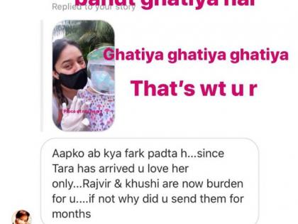 नेटीझन्सने माहीला टार्गेट करत म्हटले आहे की, 'आता काय फरक पडतो, तारा आल्यापासून, आपण फक्त तिच्यावरच प्रेम केले. राजवीर आणि खुशी आता तुमच्यासाठी ओझे झाले आहेत. असे नसते तर तुम्ही त्यांना इतक्या महिन्यांसाठी का पाठवले असते? स्क्रीनशॉट शेअर करत 'मॅडम, तुमची विचारसरणी खूप खराब असल्याचे सांगत तिच्यावर टीकाही करत आहेत. नेटीझन्स इथवरच थांबले नाहीत त्यांनी स्वतःच्या मुलीला आता वेळ देता यावा म्हणून दत्तक घेतलेल्या मुलांना तुम्ही जाणूनबुजून दुर्लक्षित करत असल्याचे बोलत आहेत. यावर माहीनेही गप्प न राहता सडतोड उत्तर देत नेटीझन्सवर संताप व्यक्त केला आहे.