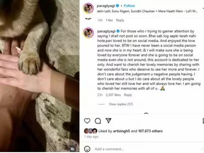 अलीकडेच पराग त्यागीने एक व्हिडीओ शेअर केला आहे, ज्यामध्ये शेफाली आणि पाळीव कुत्रा सिम्बाचा हात दिसत आहे. कॅप्शनमध्ये लिहिले की, आपण नेहमीच एकत्र राहू. चाहत्यांनी या पोस्टला भावनिक म्हटले आणि पराग त्यागीला धैर्य ठेवण्यास सांगितले, तर काही युजर्सनी त्याच्यावर प्रसिद्धी मिळवण्याचा आरोप केला. पराग त्यागीने शेअर केलेल्या व्हिडीओवरील कमेंट सेक्शनमध्ये लिहिले की, 'जे लोक शेफालीच्या मृत्यूनंतर इतक्या लवकर पोस्ट करू नये असे सांगून लक्ष वेधण्याचा प्रयत्न करत आहेत... तर भाऊ, सगळेच तुमच्यासारखे नसतात. परीला सोशल मीडियावर राहणे खूप आवडत होते आणि तिला मिळणाऱ्या प्रेमाचा आनंद घेत होती. तसे, मी कधीच सोशल मीडियावर नव्हतो.'