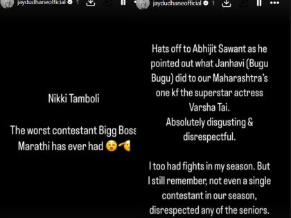 जय दुधाणेने निक्की तांबोळीलाही चांगलंच सुनावलं आहे. जय लिहितो, "निक्की तांबोळी ही बिग बॉस मराठीच्या आजवरच्या इतिहासातील सर्वात वाईट कंटेस्टंट." अशा शब्दात जय दुधाणेने निक्कीवर राग व्यक्त केलाय. वर्षा उसगावकरांचा वारंवार निक्कीकडून अपमान केला जातोय. त्यामुळे संपूर्ण महाराष्ट्राकडून संताप व्यक्त केला जातोय. आज विकेंड का वारमध्ये रितेश देशमुख याप्रकरणी इतरांना कसं सुनावणार, हे पाहावं लागेल.