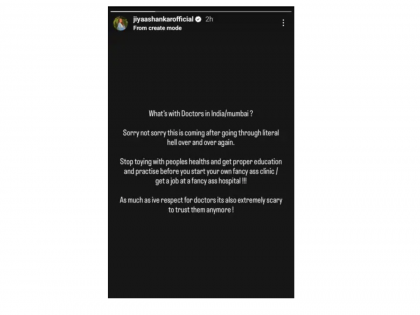 जियाने तिच्या इन्स्टाग्राम स्टोरीद्वारे आपला एक अत्यंत वाईट अनुभव शेअर केला आहे. तिने मुंबई/भारतातील डॉक्टरांच्या कार्यशैलीवर थेट टीका केली आहे. तिच्या पोस्टमध्ये जियानं लिहलं, "भारत/मुंबईतल्या डॉक्टरांचं काय चाललंय? माफ करा. पण हे सगळं बोलावंसं वाटतंय. कारण- मी सतत नरकासमान अनुभव घेतला आहे".